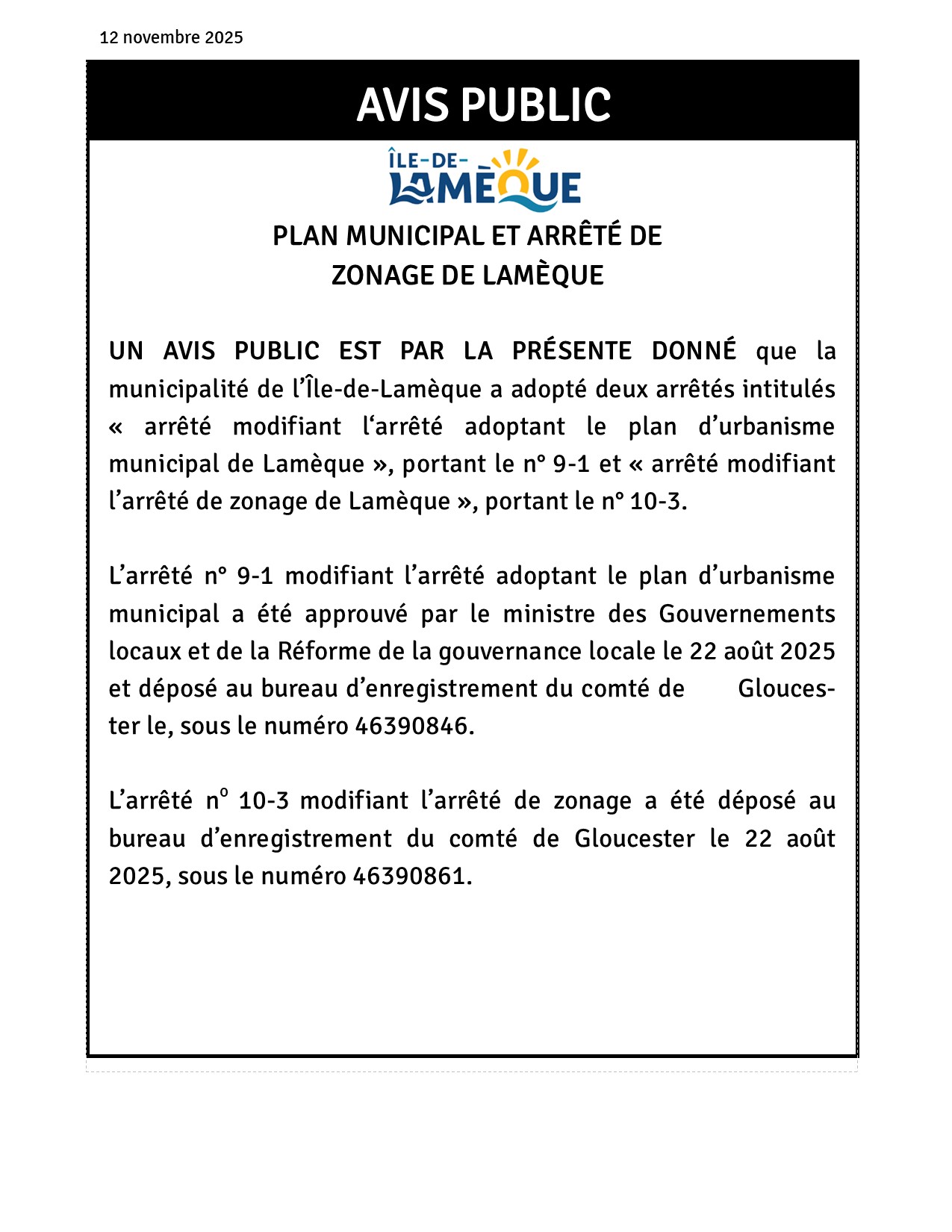 12 novembre 2025-un avis public est par la présente donné que la municipalité Île-de-Lamèque a adopté deux arrêtés intitulés ...