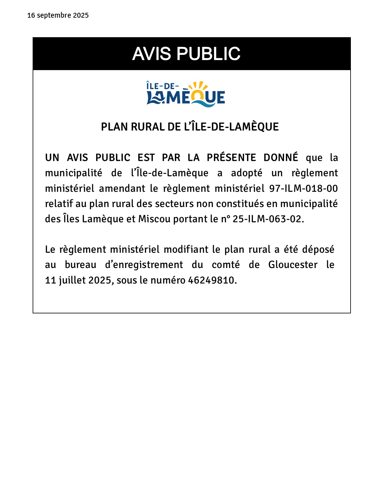 30 septembre 2025 – UN AVIS PUBLIC EST PAR LA PRÉSENTE DONNÉ que la municipalité de l’Île-de-Lamèque a l’intention de modifier le plan municipal…