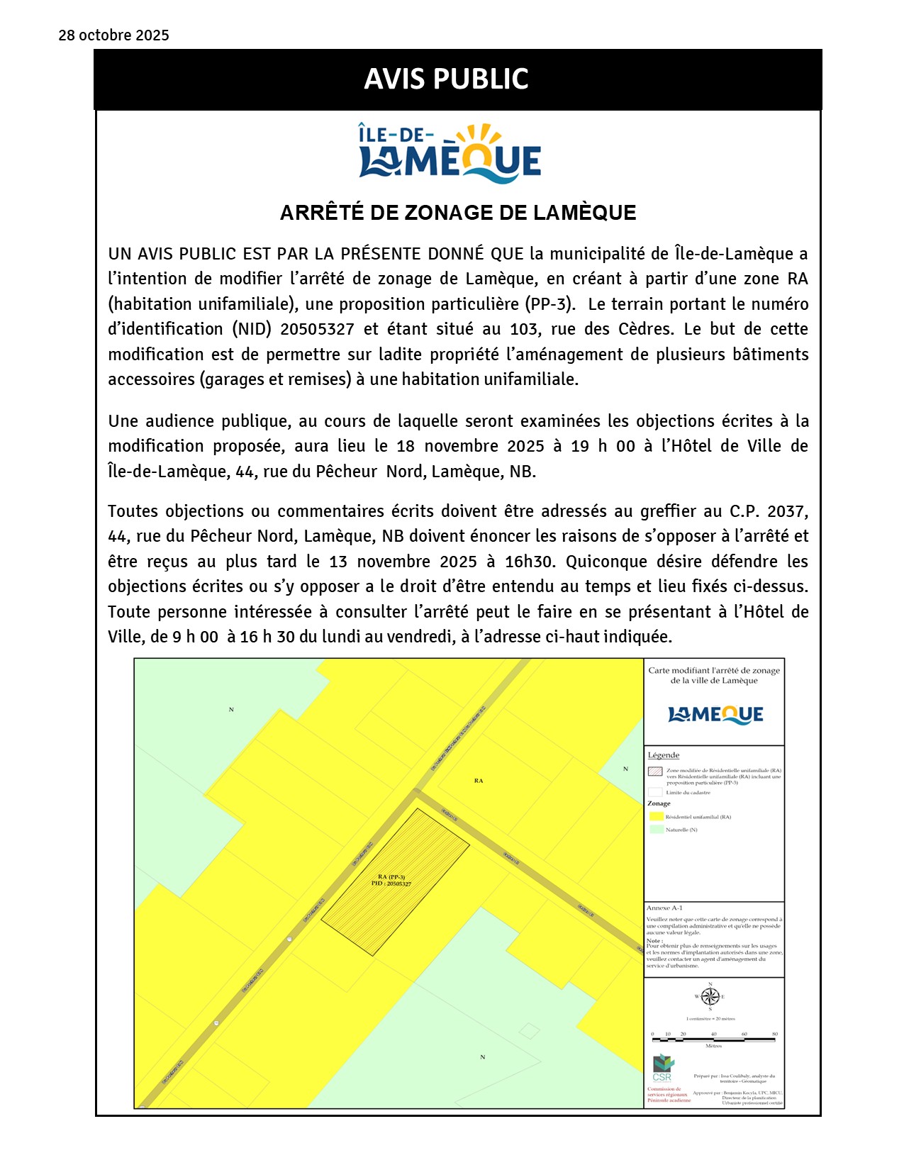 28 OCTOBRE 2025 – UN AVIS PUBLIC EST PAR LA PRÉSENTE DONNÉ QUE la municipalité de Île-de-Lamèque a l’intention de modifier l’arrêté de zonage…